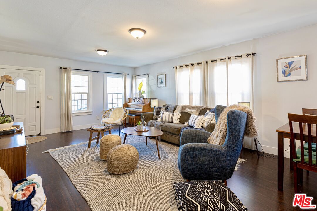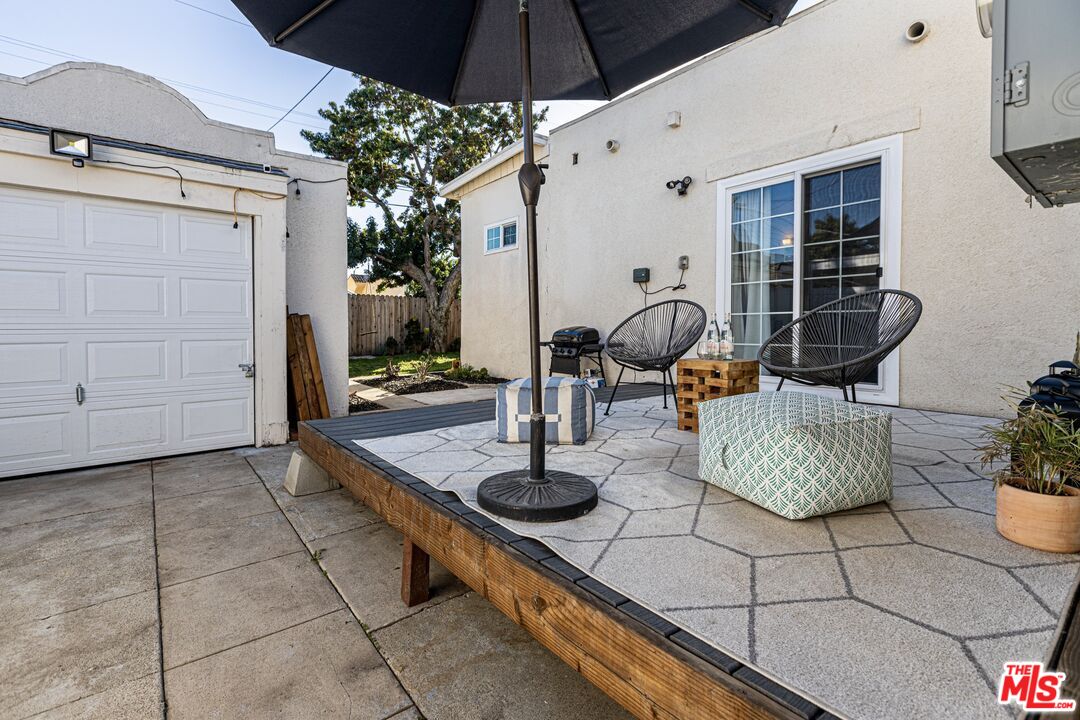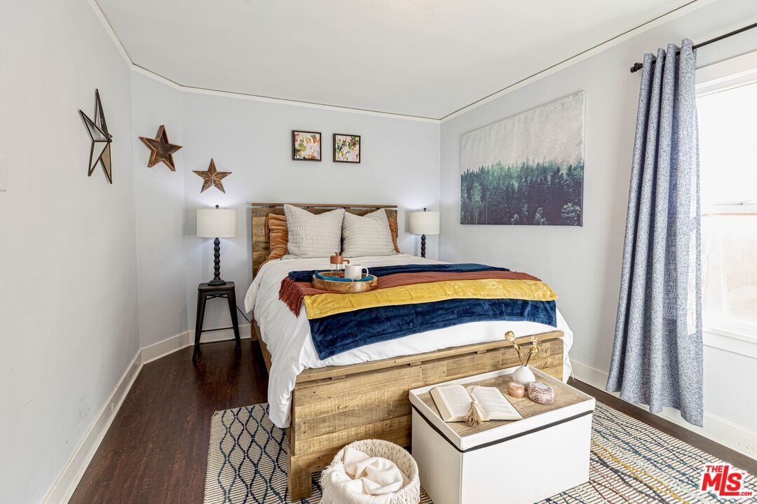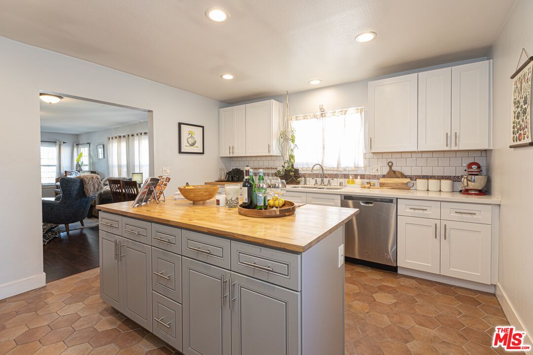 This 1920s Spanish-inspired cottage is situated in the Gramercy Park neighborhood in the city of Los Angeles. As you make your way through the front yard lined with arched wrought iron fencing, you are immediately welcomed by the idyllic arched entryway and eye-catching brickwork surrounding the front door. The covered porch enclosed with railing makes for enhanced privacy. Upon entering and peering inside, immediately the charm and warmth of this home become strikingly clear as the large windows in the living and dining areas create a naturally illuminating, airy environment. The light, bright, and rustic modern kitchen features white shaker cabinetry, a butcher block island with bar seating and additional cabinets, quartz countertops, subway tile backsplash, recessed lighting, direct access to the backyard, and stainless steel appliances that include a gas range/oven, refrigerator, dishwasher, microwave, and double-bowl sink with faucet sprayer. Off the kitchen is the large master bedroom that boasts an ensuite half bathroom, adobe-style fireplace, wall sconces, and direct access to the back yard for easy indoor-outdoor living. Off the living room is a hallway that leads to the full bathroom and two bedrooms, both with closets and extra storage space. This home maintains classical, historical details with dark laminate wood and terracotta tile flooring throughout, and traditional recessed wall niches for decorative displaying. The private, spacious back yard is ideal for entertaining and hosting any social or intimate occasion or gathering by the fire pit. The gated driveway extends to the side yard and leads to the detached garage, perfect for RV or tandem parking. And, the drought-friendly landscaping makes this home well-suited for the California weather. Centrally located near the city's biggest sporting and concert venues; SoFi Stadium, The Forum, YouTube Theater, and the anticipated Intuit Dome.